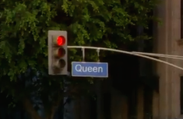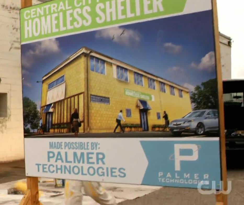 Did you catch some of the Arrow shout outs? When Barry miraculously paints the entire side of a building in under 3 seconds, this sign is posted just outside: Central City Homeless Shelter, made possible by Palmer Technologies. And as Barry zipped down the street toward Jitters he went through the Queen intersection (running a red light, I might add!).