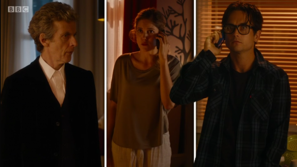 The alien in Dr. Sim’s body confronts The Doctor, Lucy and The Doctor’s traveling companion, Nardole (Matt Lucas). The Doctor rescued him after the events of “The Husbands of River Song. Lucy, The Doctor and Nardole are in a tight spot when The Ghost comes to the rescue. He knocks out Sim and takes Lucy home. Grant is confronted by The Doctor and Nardole and he is anxious because Mrs. Lombard is coming home. Lo and behold, The Doctor realizes Mrs. Lombard is Lucy. He is dealing with two humans with dual identities. She questions The Doctor effectively and learns the scoop on the aliens, but all she really wants is an interview with The Ghost. The Ghost calls and OK’s the interview.