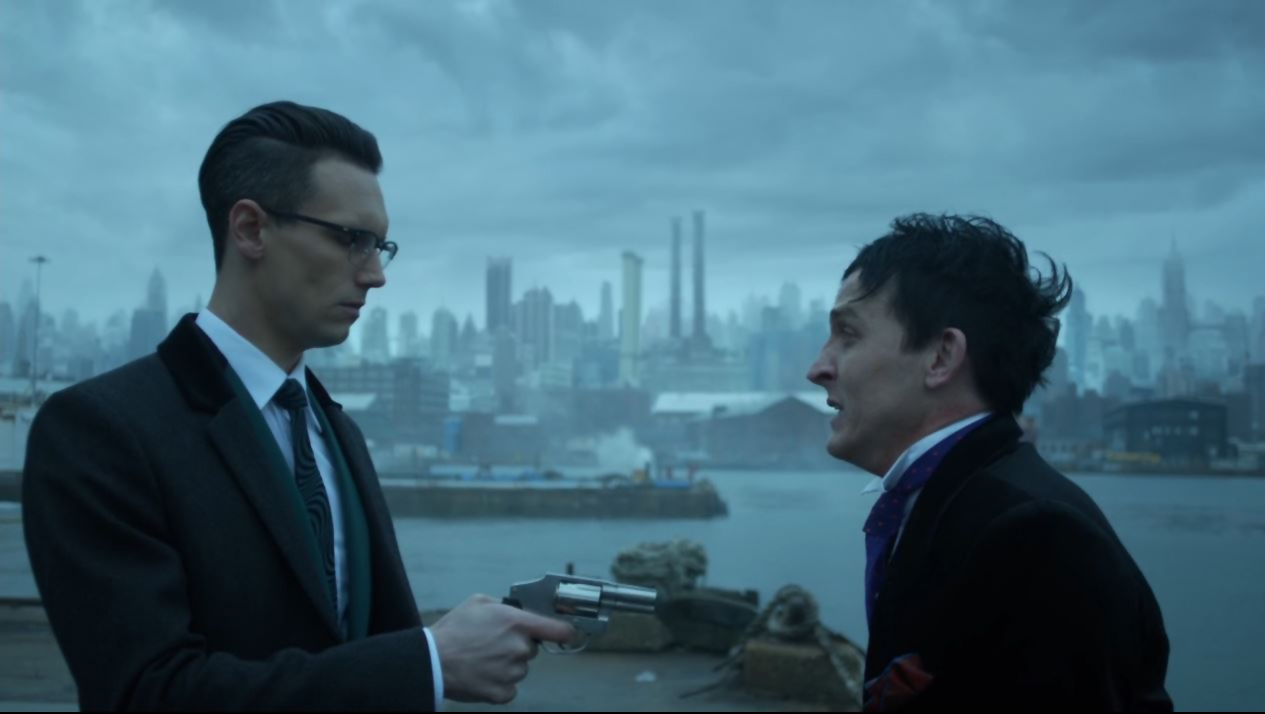 Oswald is searching for and finds Ed. But Ed has the Penguin right where he wants them, strapped to Isabella’s car under a barrel of acid. A cop rescues Oswald. But his home is no safer. Butch and Tabs are there looking to take out Ed now that Oswald is ruined. They drag him back to the Sirens Club for Babs to question. Babs wants Ed’s location. Oswald realizes that Ed was right he doesn’t know what love is and has never sacrificed. Ed is learning the gentle art of love but has lost his friend in the process. So he won’t give up Ed to the crew. Ed walks out up-happy. He wanted Oswald to die convinced he couldn’t love anyone. Ed takes Oswald out to the docks (man that is NOT a good location for Penguin). Oswald argues that he created Ed and is the only one who can see his potential, but it is not enough. Isabella was a bridge to far. Ed shoots Oswald and pushes him into the bay.