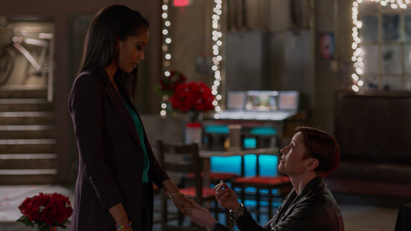 Supergirl declares her CatCo quittedness to the Superfriends. Brainy has a plan to draw Nyxly out so they can finally show down the showdown. He needs Lena and Nia. Supergirl and J’onn are working together, interrupted by Alex who shows off the bling she’s going to put on Kelly! There’s a history lesson on the year ago that Alex and Kelly mutually cried out Hans Gruber as the best movie villain and here we are ready to make it a forever thing. Esme could not care less about elaborate proposal planning as long as there’s mozzie sticks. My girl!! Al’s Bar is not available on their special night because it’s all booked up for a special event. Alex is majorly disappointed, and confused, because Al’s is never booked for anything.