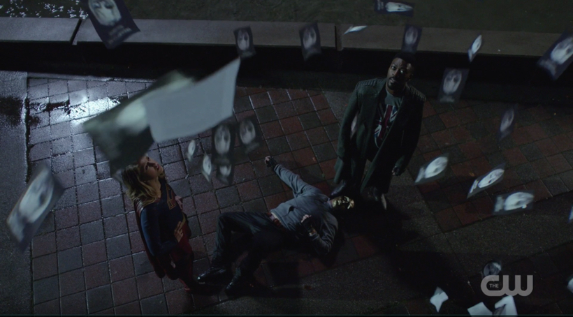 A happy couple is walking through Midtown Park and is accosted by the Children of Liberty because their attack dog has sniffed one of them as an alien. They are wearing Agent Liberty type masks and grey hoodies adorned with the yellow star that is shaped like Agent Liberty’s on his armor. Along comes Manchester Black to take down the idiots. As he’s being overpowered Supergirl comes on the scene and saves him. Among the idiots is Officer Petrochelli whom J’onn and Manchester met at the bar looking for Fiona. As Supergirl and Manchester clean things up a ton of flyers are dropped on the city by drone informing everyone of the Children of Liberty’s Manifesto. The flyer says, “This Is A Manifesto,” just in case you missed it. Ben Lockwood is perturbed that the boys got excited and jumped the gun on their reveal but he composes himself to be a good dad getting ready for Thanksgiving. He’s also worried that Petrochelli is going to squeal. To take care of James, Kara takes his place and shows up on the televised debate show that Lena scheduled James to be on, but he doesn’t want to be on. Ben is the counter point of the argument and the two go back and forth about how the aliens are either welcome or how they will celebrate Thanksgiving in 100 years reminiscing about how they destroyed the humans. At the DEO Col Haley will not give precious resources to said manifesto because that’s an FBI problem. Alex and Supergirl task Brainy anyway with figuring out who’s behind it. James gets in deeper with the Children of Liberty and befriends Tom, a member of the group and walks around a neighborhood with him and his attack dog. Tom keeps texting his wife as soon as the dog goes bananas. Turns out Tom is identifying alien houses. On Thanksgiving the attack comes and our team puts the plan together while they’re enjoying dinner. Supergirl goes to battle with a lizard that morphs into a fire-breathing dragon that is trying to protect his family. Once Supergirl finds out that “Spike” is trying to be a loyal protector the two make piece and she is glad that dragons still like her even if dogs don’t. If this is confusing, that’s because it was. Confusing.