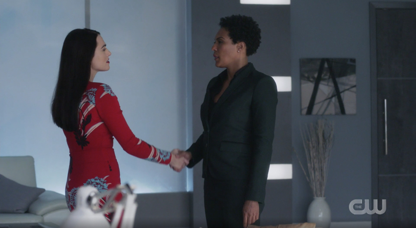 Alex is having a little bit of a mid-life crisis. She looks at all that J’onn has accomplished since he left the DEO and she also sees how little she’s accomplished at the same time. She was dating and putting her adoption portfolio together and then let everything drop. She doesn’t really give a specific reason why but Kara and J’onn discuss later in the episode that the reason is protecting Kara (again, uhhhhhh, what?). When they are out in the field and the Menagerie snake attacks Kara, Alex does immediately panics to make sure Kara is OK. Later in the episode during Nia and her roommate’s party Alex meets back up with Becca whom Alex apparently sat down for drinks with twice. They catch up and it’s clear that Becca really heard what Alex was about and wanted to support her. Methinks we’ll be seeing Becca again soon, especially since Kara picked up her number again for Alex to have.
