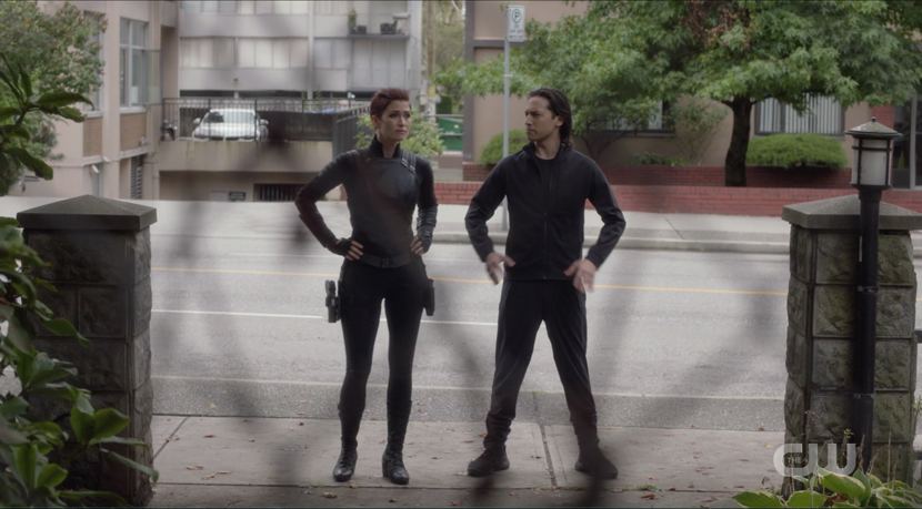 After Brainy figures out that Rama Khan (“Think God for this selfie generation.) is on the scene the two Fortress field-trippers go off to get weapons while Alex and Brainy will keep looking for RK and Rip Roar as well. They get a confirmation signal on Rip Roar and go to the spot, only for it to be a trap and a bomb. Brainy gets a nasty gash on one of his receptors and Alex comes away with a dizzying concussion. Alex is rather perturbed that Leviathan would put Rip Roar out there for no good reason but Brainy says they can use the armor to put clues together. Back at the DEO, Alex is recuperating and Kelly shows up. Alex should have called her to let her know that she was OK, but she didn’t so Kelly started going down worst case scenario territory since her fiancée died before. Kelly is ready to break things off with Alex to protect herself but Brainy interrupts because the gash in his head has made him come to the answer even quicker. He and Alex rush off to the building that is close to the National City tar pits that also has the signal that Brainy has identified as Leviathan’s logo. It’s also close by to his favorite coffee shop and his Tuesday morning Pilates. Anywho, the two go into the building but Gemamnae (see notes below) disguises where Leviathan actually is and the two leave. Later that evening Alex goes to find Kelly and tells her that she was in a hurting place when Kelly came on the scene and helped her heal. She wants to offer the same to Kelly. Kelly asks what if they can’t fix what’s wrong and Alex answers that they will because “you feel like home. You feel like home too.” They kiss and start on their healing journey.